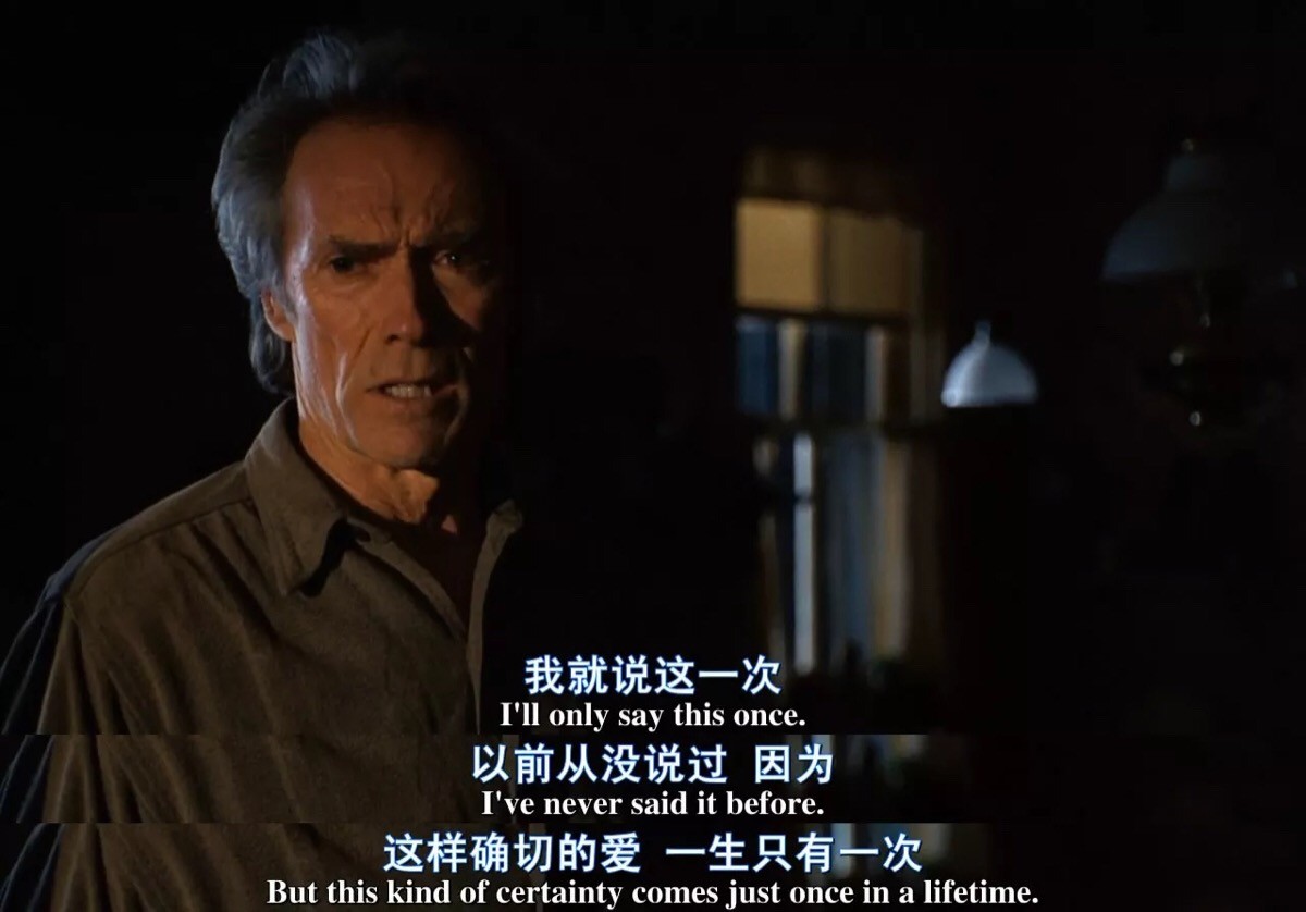 还记得《廊桥遗梦》的那个家庭主妇与西部牛仔摄影师那触电般爱情的惊鸿一瞥吗?也许人的一生——绝对的爱情,有且只有一次。