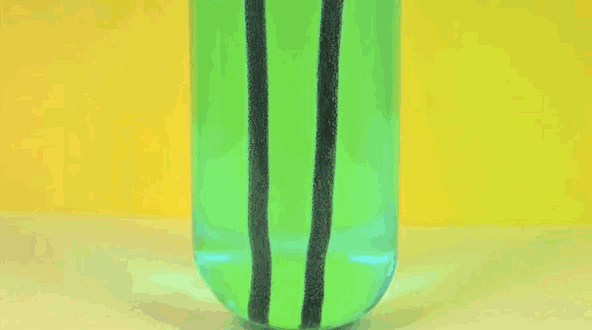 充满氨气的瓶子接触水,氨气迅速在水中溶解,瓶内气压降低,水倒吸进瓶中形成喷泉,pH的变化又让指示剂变色。只不过,在这里水溶液中加入的指示剂不是酚酞,而是百里酚蓝,它从中性的黄色变成碱性的蓝色。