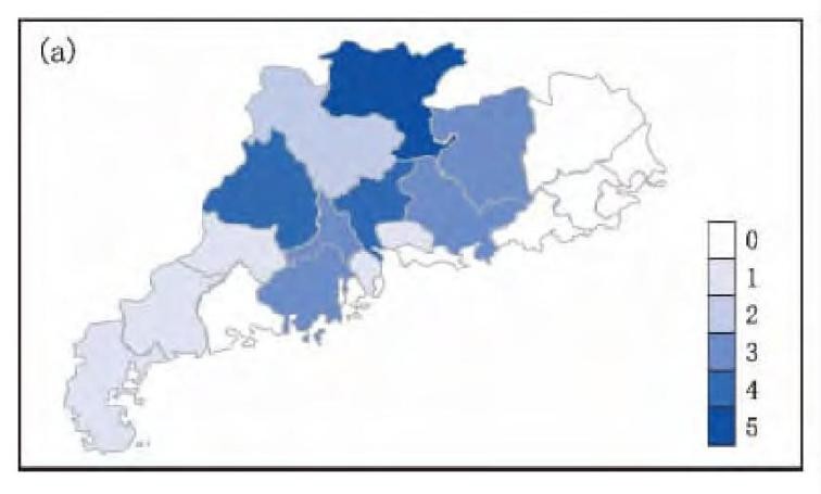 广东十年间各地市累计冰雹日数(天)。