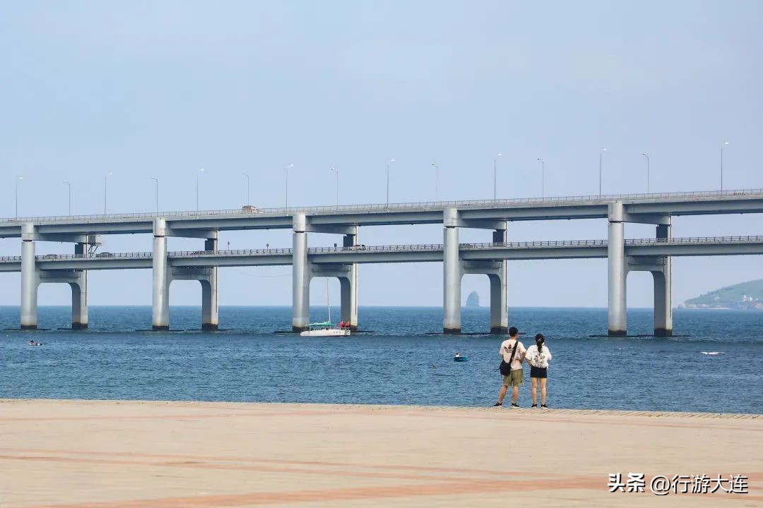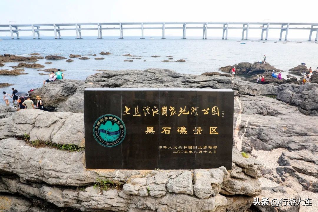 来到海边,面前是成片的黑色礁石,这些黑石礁形成于距今七亿年前后,古老的岩石表面被风化,表面呈黑色,由此得名。这里视野开阔,蔚蓝的大海一望无际,跨海大桥伫立在不远处的海面上,气势十足。