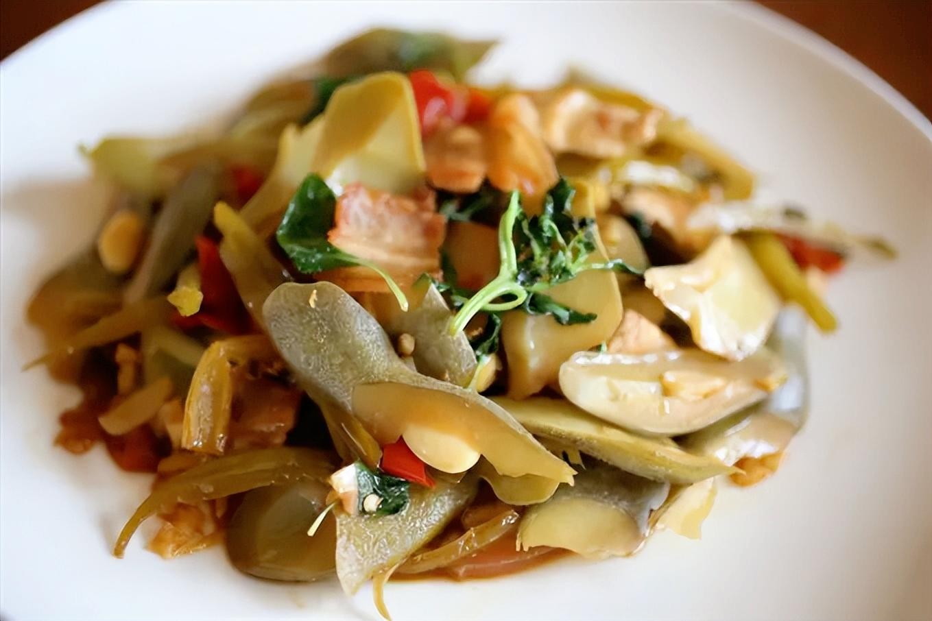 做法:将龙爪豆提前一天处理侵泡,取龙爪豆切小块,起锅烧油,加入生姜、小米椒、蒜爆香,加入切好的五花肉炒至出油,加入龙爪豆翻炒,加适量盐翻炒入味即可。