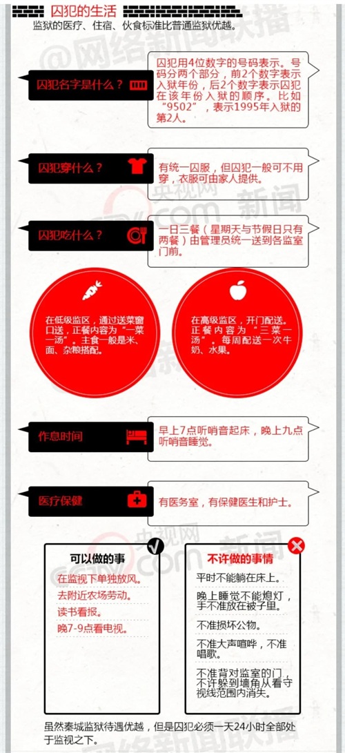 监狱的每个房门上方,与厕所马桶齐高的位置设有窥孔,供哨兵对犯人实行全天候监视。秦城监狱还有专为囚禁高官的牢房,每间不仅面积较大,甚至配备了写字台。