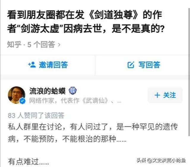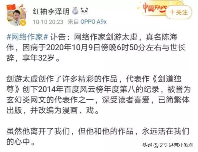 网络名著《剑道独尊》作者玄幻大神剑游太虚噩耗传来,年仅32岁