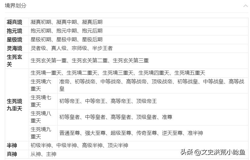 凝真、抱元、星极境、灵海境、生死玄关、生死境、半神、真神八大境界,其中还有三六九等的小境界。自成体系。