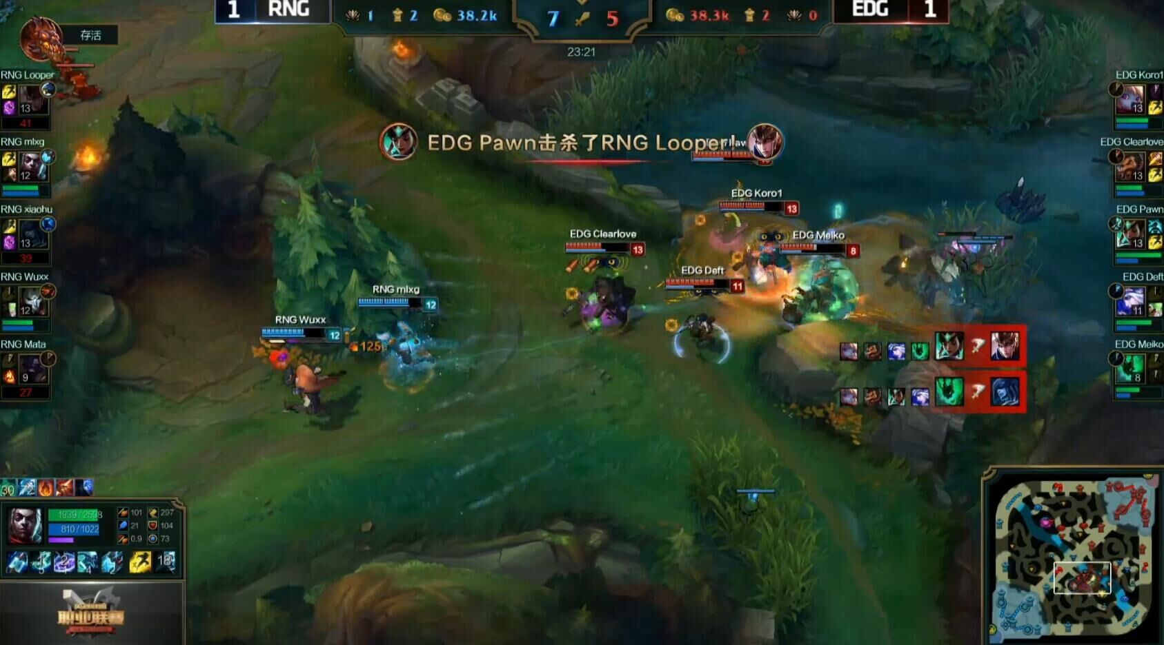 19分钟,EDG经济略微劣势,EDG利用双传送,在上路爆发一波团战,先集火秒掉RNG的C位,最后集火艾克,打出了一换五。经济实现反超。