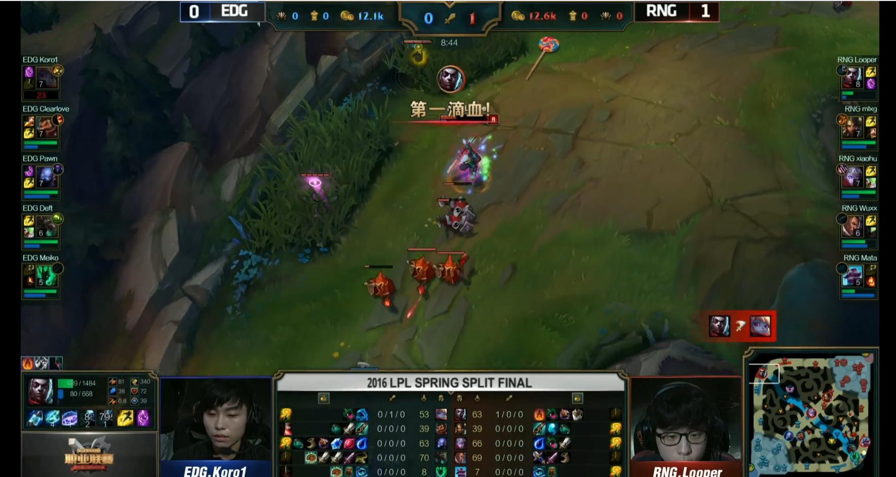 第二场8:40,上路RNG上单looper的艾克对线EDG Koro1完成单杀,拿下一血。