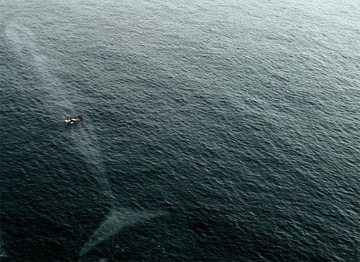 这是一艘小船和世界上最大的动物--抹香鲸相遇的照片,可是总觉得心里慌慌的。