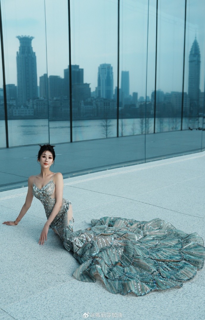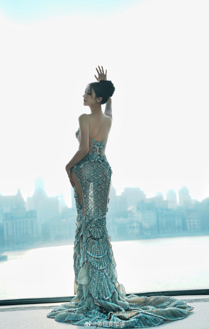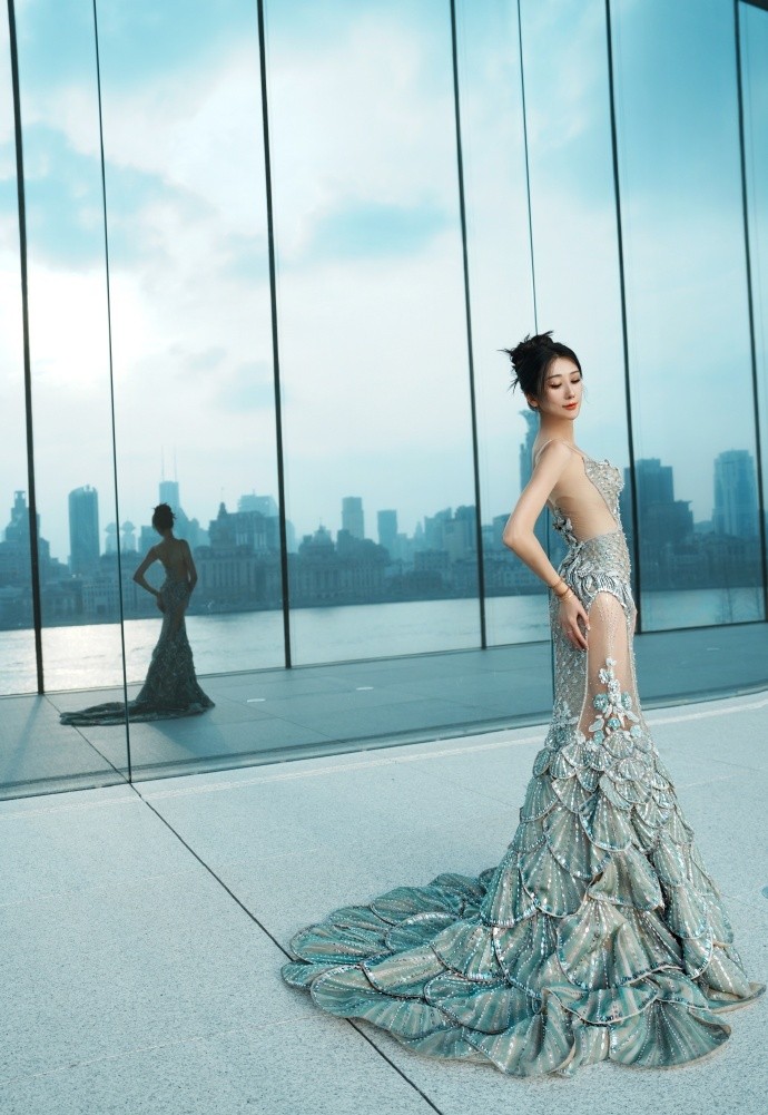 这是蒋丽莎在活动场地外面拍摄的照片。我们看到这件高定鱼美人长裙是低胸设计,大腿外侧和后背是半透视的,臀部是包臀设计,特别秀出好身材;而她头发盘起,五官精致,如出水芙蓉绰约多姿。她在玻璃幕墙拍摄,而幕墙倒映外面的黄浦江,现实的人像与幕墙的倒影显得虚实结合,十分有艺术感。