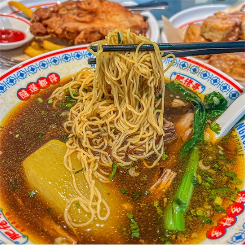 这是澳门人早餐、下午茶的心头好。传统的竹升面制作工艺独特,师傅坐在粗大的竹竿上,利用自身重量,反复碾压面团,如此制成的面条劲道十足。