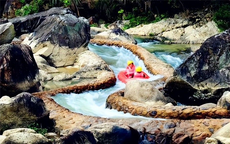 娱乐项目九龙谷漂流:全程约 2.8 千米,途经 10 余个跌水、10 余道弯,顺溪漂流,可欣赏到峰奇石秀、泉清谷幽的美景,以及溪流中千姿百态的奇石。