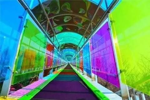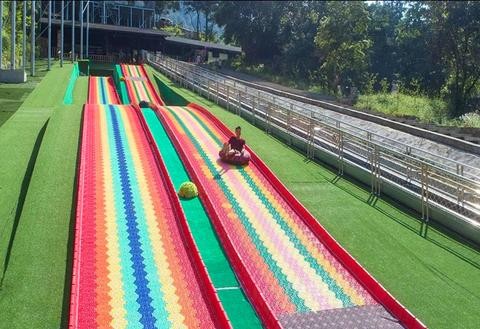 彩虹滑道:由七种五彩斑斓的色彩铺设而成,远远眺望好似一道彩虹挂在山上,大人小孩都可以坐在橡皮船上,从长长的彩色滑道上滑下,体验刺激与欢乐。