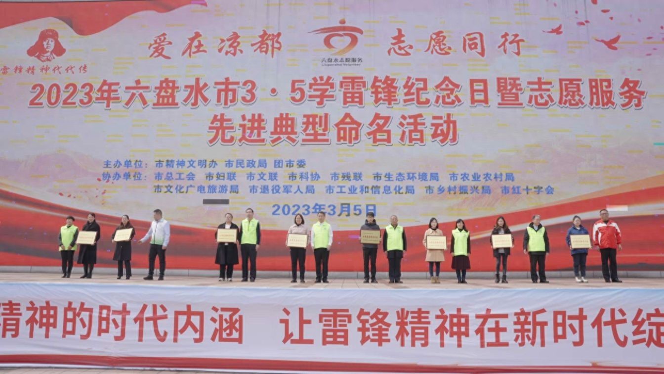 3月5日,六盘水市2023年3·5学雷锋纪念日暨志愿服务先进典型命名活动在六盘水市人民广场举办,授予了39名“六盘水市2022年度优秀志愿者”、28个“六盘水市 2022年度优秀志愿服务组织”、13个“六盘水市2022年度优秀志愿服务项目”及8个“六盘水市2022年度优秀志愿服务社区”。