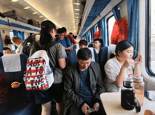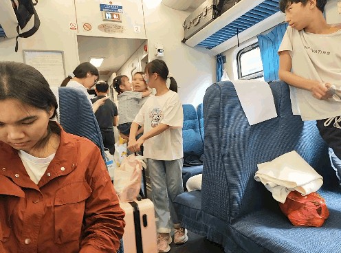 东莞站上车的乘客多上车慢,耽误了两分钟,列车也在晚点两分钟后终于发车。我坐了下来,发现我所在的3号厢已经满员,过道也有人。乘务员建议:没买到座位票的乘客去“加1”厢!