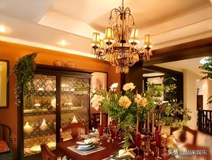餐厅上方的水晶吊灯和橱柜中的古董瓷器