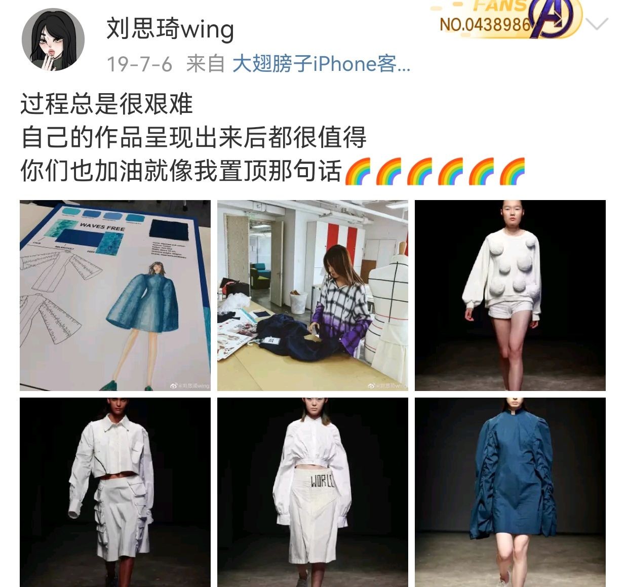 放弃娱乐时间,熬夜学习专业知识,看着自己的画稿,变成了衣服,她的心中满是自豪感、成就感。就像她给粉丝说的:“过程总是很艰辛,但看到自己的作品可以呈现出来,就觉得一切都值得”。因为努力,刘思琦赢得学校的肯定和鼓励。
