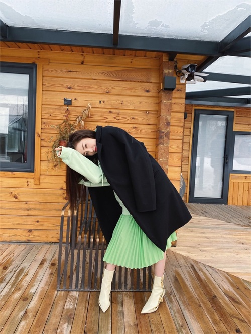 绿色是由蓝色和黄色对半混合而成,外搭一件黑色的毛呢大衣,很好地中和了绿色带来的张扬感,更是给整体造型增添了几分沉稳与优雅。下身选择了一条和卫衣同色的百褶裙。饱和度较高的绿色与卫衣的浅绿色相呼应,在统一的色调下寻求明度的变化,倒也不失为明智的选择。