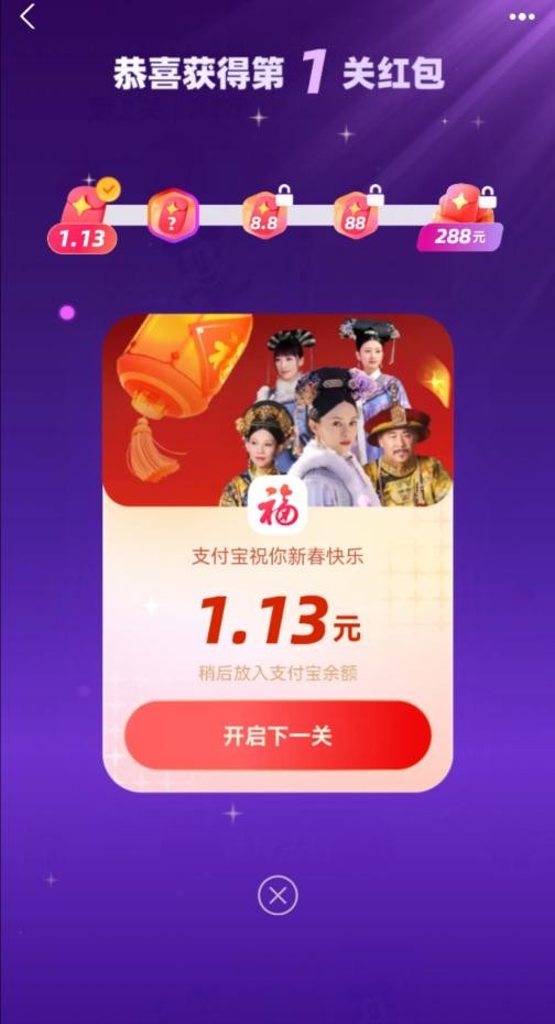 记者大约扫了六七次,就轻松集齐4张卡,合成后获得了“甄嬛传”主题的支付宝app的皮肤,领取红包“开启下一关”,则可以继续闯关合成开奖。开奖不用等到除夕,并且可以一直集福到大年初五,这也是今年集福最大的变化之一。