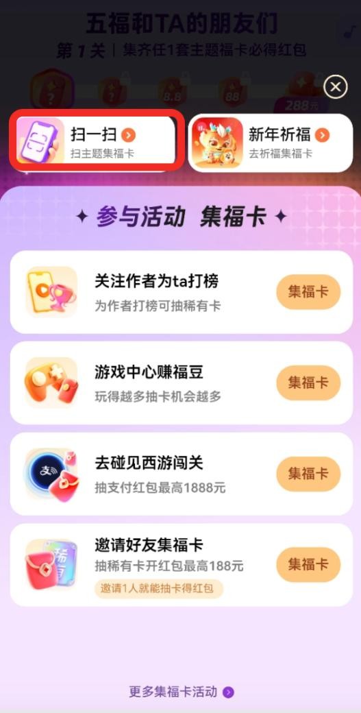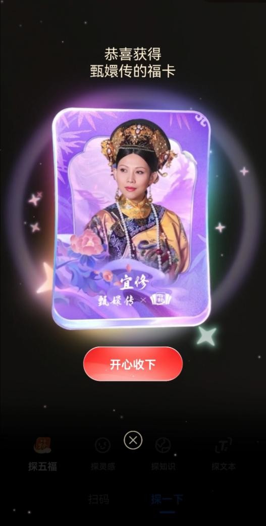 今年的集卡也比较多样,除了经典扫“福”字得卡,还可以扫所选IP主题的相关元素得卡,以“甄嬛传”福卡为例,点击“扫一扫”选择“探五福”,对着甄嬛、皇后等人扫描后,都出了几张不同的甄嬛传系列里的福卡。同时,看视频、碰一下支付也可以得卡。