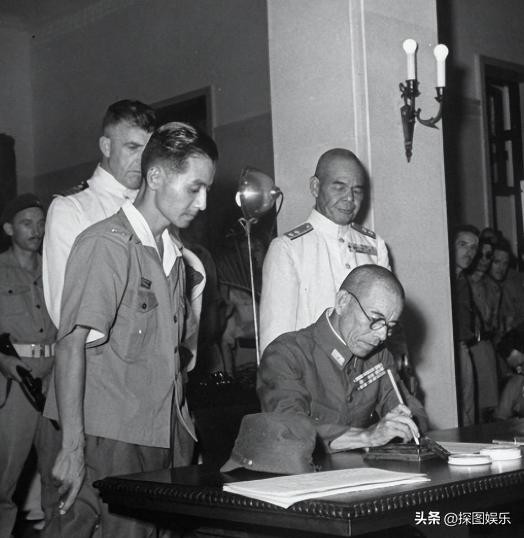 02.日本战犯正在写字,周围的人都看着他。