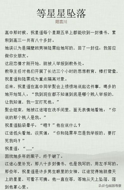 陌言川的《等星星坠落》温软校花X冷淡深情的穷小子,一个关于暗恋的故事,男主暗恋女主,非常暗戳戳地暗恋着。架空,偏现实,男主前期是真挺穷的。平淡慢热也狗血,一半校园一半都市。