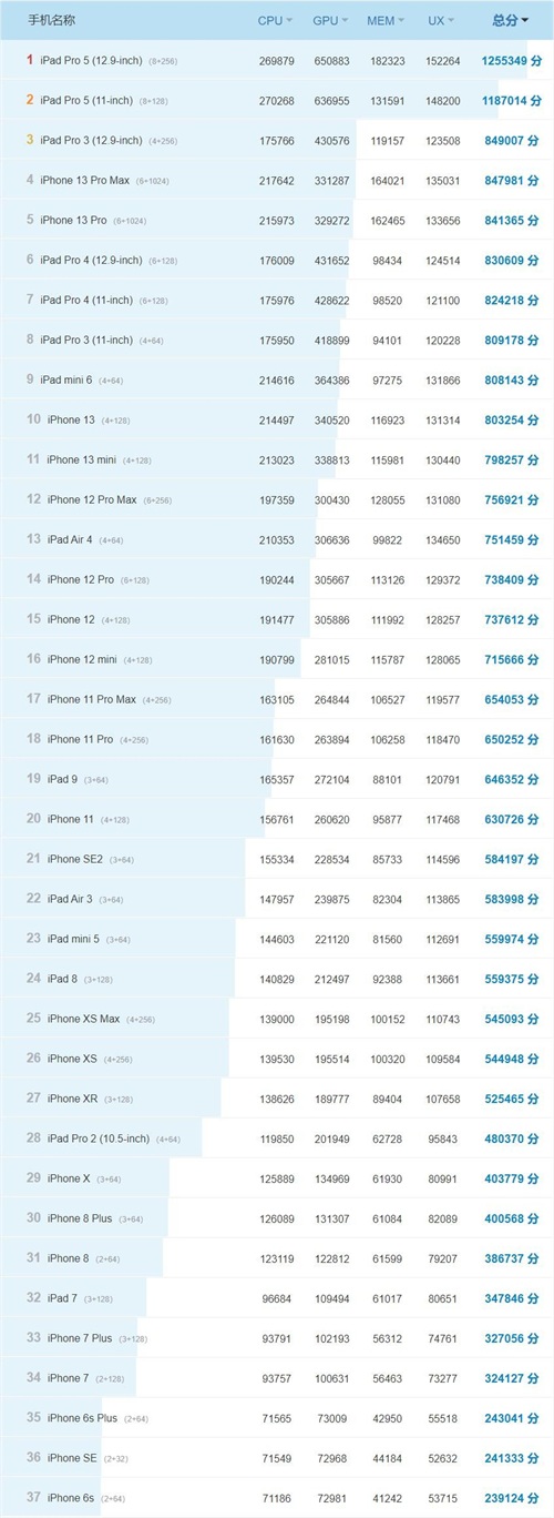 苹果跑分排行榜出炉!iPhone13 Pro Max 居然不是第一名?