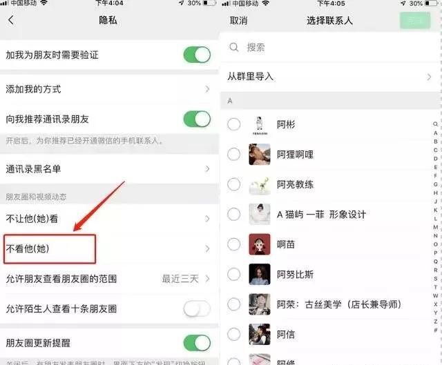 如果我们还想使用“朋友圈”功能,而只是单纯的不想看到某个人的朋友圈。我们可以在微信“设置”中找到“隐私”,然后点击“不看他(她)”,最后把需要屏蔽的好友拉进来就好了。