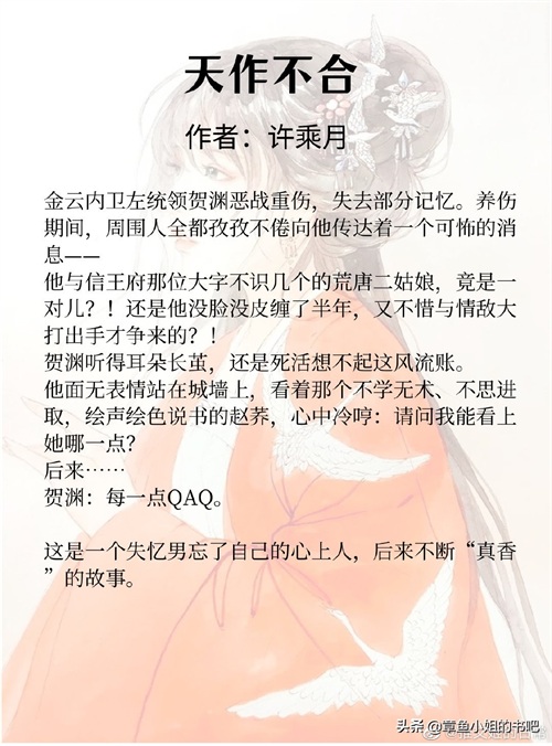 书评:架空世界文,男主死缠烂打追的女主,女主是宗室贵女,很肆意洒脱;男主是清冷板正的大内侍卫统领,比较循规蹈矩,失忆之后的男主发现自己喜欢女主,很是惊讶。中间两个人因为一些事情分开过,男主便开始了漫漫追妻路。小甜文!