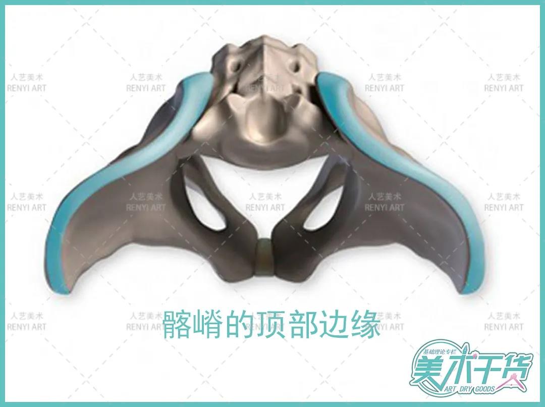 髂骨是三部分中最大的部分。2个弯曲的墙壁在后面汇聚,由骶骨连接。在表面可见的髂骨部分是被称为髂嵴的顶部边缘。髂嵴开始于正面顶部,即髂前上棘。它在背面顶部或后上髂骨脊柱的背面结束。经常提到这两个地标,绘制时这是上身躯干与胯部的分界处。