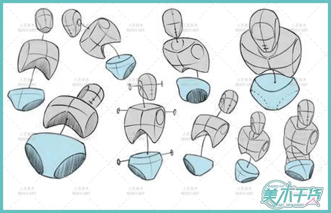 如下图所示,人的胯部位置连接上下躯干,是学习人物速写中不可忽视的重要部分。