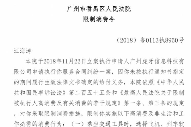 南都记者查阅中国执行信息公开网发现,2018年11月,由于嗨氏并未按照执行通知书中的指定期限付给虎牙违约金,被法院采取限制消费措施。此后,嗨氏在斗鱼也停播,并鲜少露面。