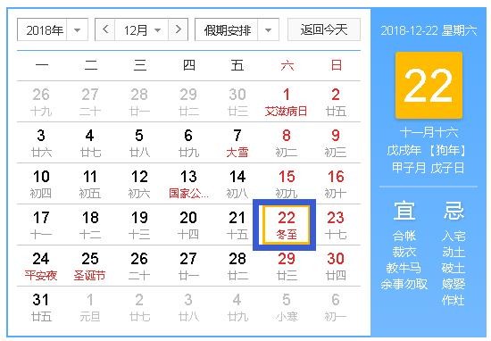 2018年冬至是几月几日星期几