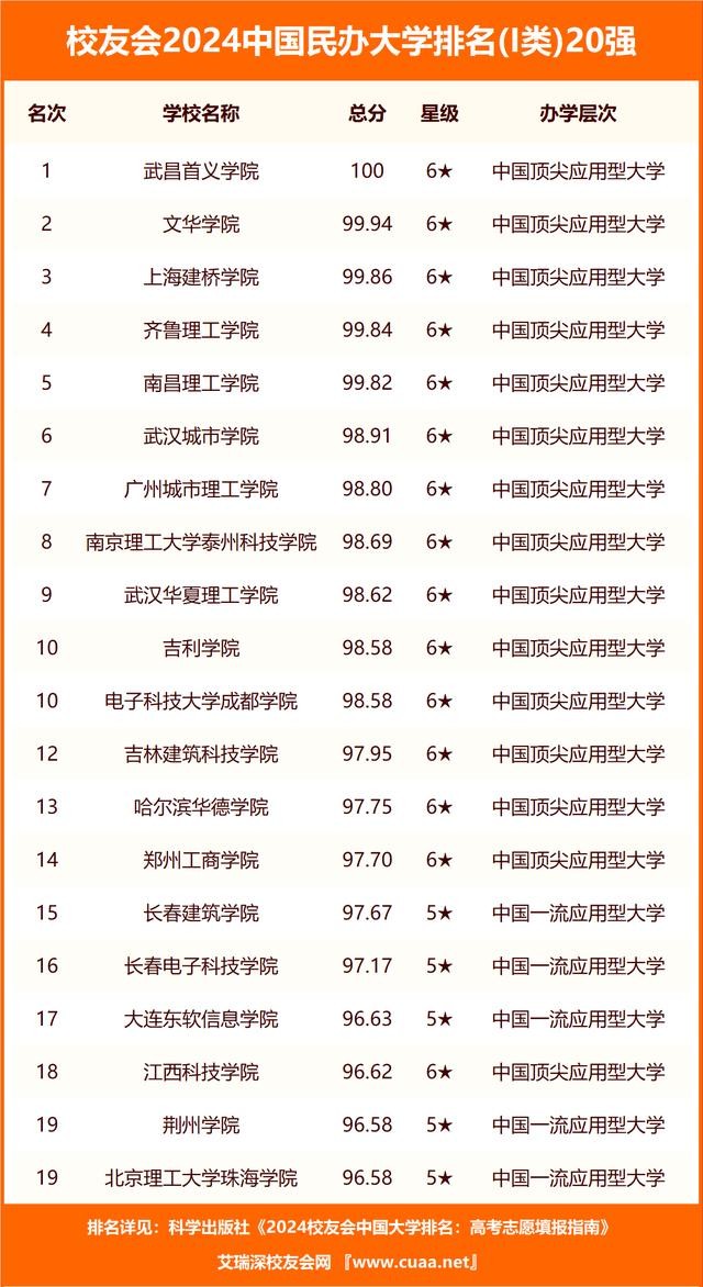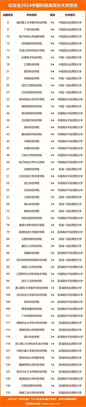 在校友会2024中国民办大学排名中,南京理工大学泰州科技学院、广东科技学院综合排名最高、办学水平最高,全国排名并列第8名,高居校友会2024中国科技类民办大学排名第一,荣膺2024中国六星级大学(6★)美誉,跻身中国顶尖应用型大学行列。