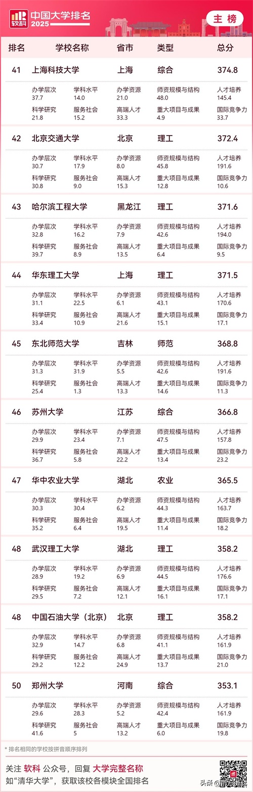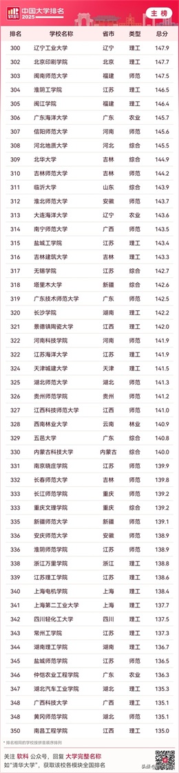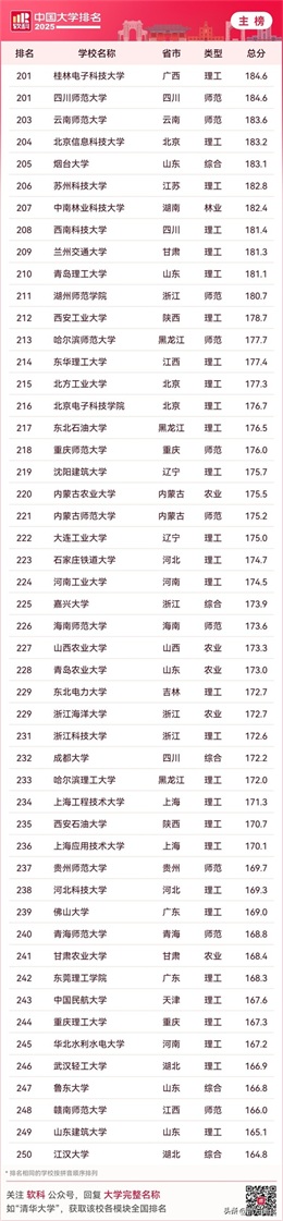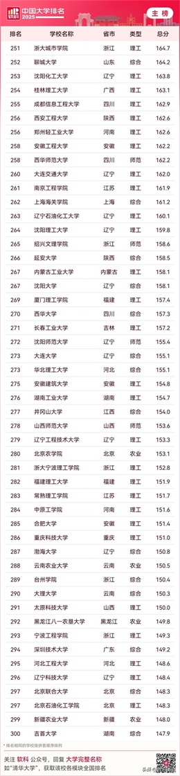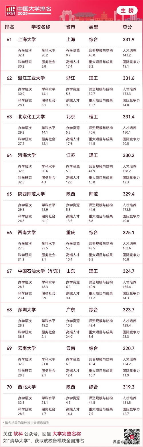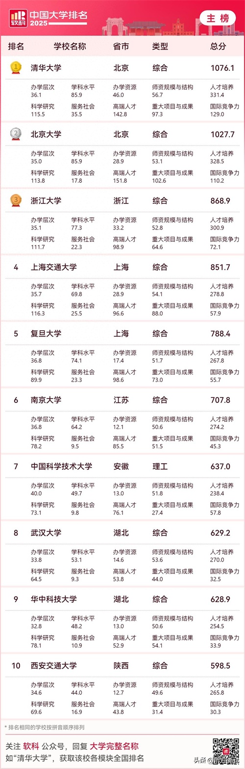 2025软科中国大学排名(主榜)的上榜高校共有589所,清华大学、北京大学、浙江大学11年蝉联全国三甲。上海交通大学、复旦大学位列全国前五。其他位列全国前十名的大学依次为南京大学(第六)、中国科学技术大学(第七)、武汉大学(第八)、华中科技大学(第九)、西安交通大学(第十)。