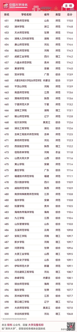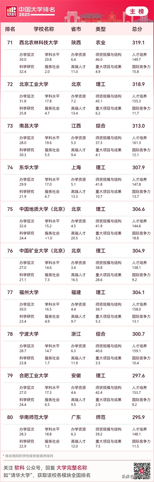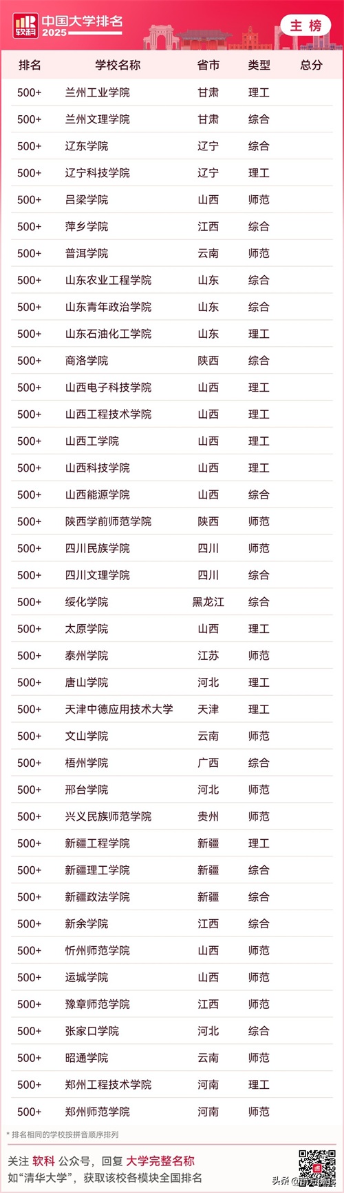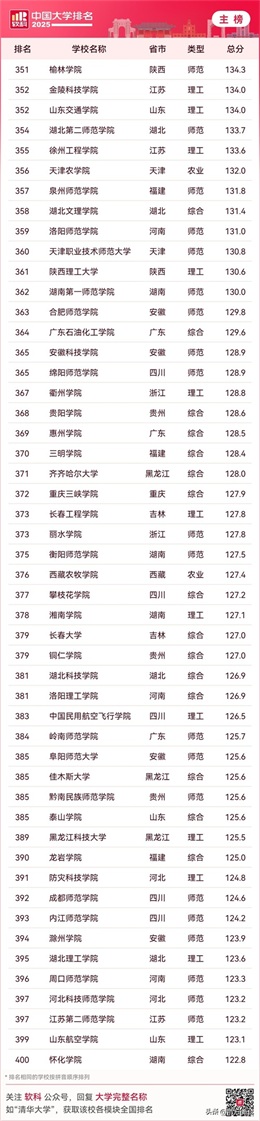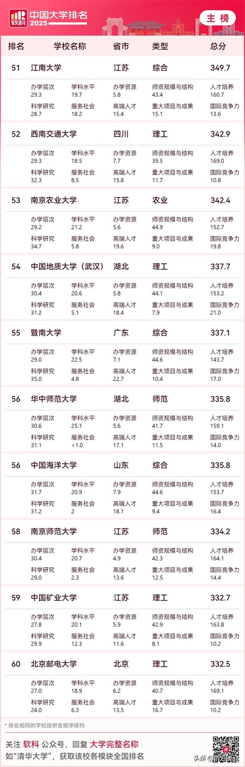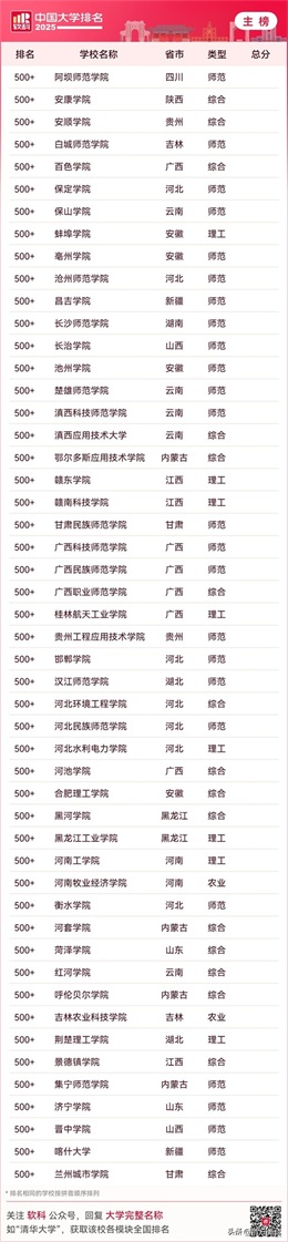 2025软科中国大学排名(主榜)的上榜高校共有589所,清华大学、北京大学、浙江大学11年蝉联全国三甲。上海交通大学、复旦大学位列全国前五。其他位列全国前十名的大学依次为南京大学(第六)、中国科学技术大学(第七)、武汉大学(第八)、华中科技大学(第九)、西安交通大学(第十)。