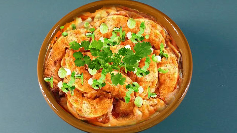 4,出锅扣盘,取出大葱节、姜片、花椒、茴香、八角、干辣椒,撒上葱花、香菜即可食用。