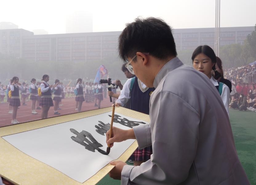 “书法是无声的乐章,音乐是有声的书法。”各方阵中,书法表演也吸引着观众们的目光。书法专业5名少年身着古典服饰,摊开卷轴、挥毫泼墨,书写着对祖国和学校的热爱,一旁的古典舞《镜中渊》与书法表演交织融合,展现着音乐和艺术的抑扬顿挫、和谐统一。