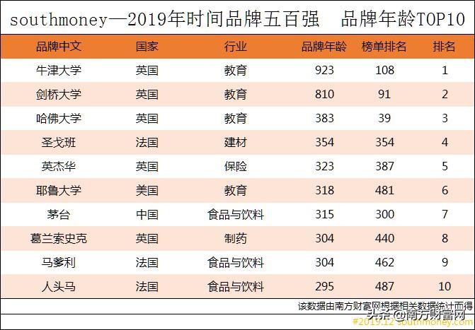 今年榜单中最古老的品牌前三强均是来自英国的高等院校,牛津大学、剑桥大学、哈佛大学,三所院校的品牌历史分别为923年、810年、383年。同时,中国的茅台也以315年的品牌历史位列最古老的的世界五百强品牌第七名。