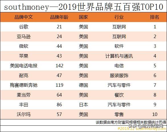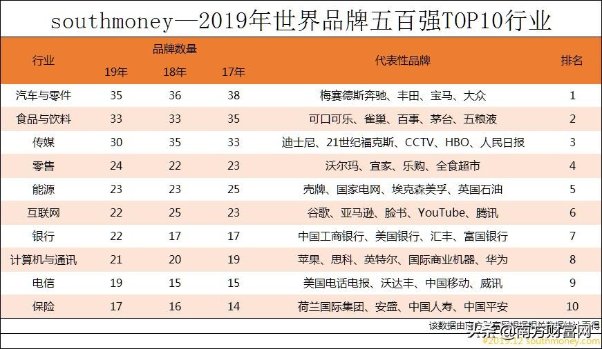 以上就是南方财富网为读者们带来的2019年世界品牌五百强排行榜的相关信息,本文是根据有关数据及近期事件所撰写分析文章,并不构成投资建议,请投资者根据具体情况权衡利弊,据此操作,风险自担!(本文属于非商业性文章)