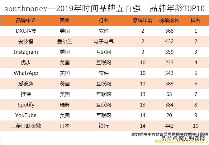 世界五百强品牌中,品牌年龄最小的上榜企业是来自美国的软件公司DXC科技,品牌成立仅有2年依然位列世界368位。榜单前十强品牌入围年龄为14年,新晋互联网公司占6个席位,软件2家,电子电气1家,银行1家。
