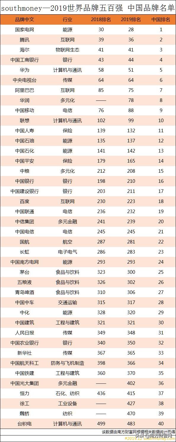12月11日,有机构在美国纽约发布了第十六届2019年世界品牌五百强名单,榜单根据80000个知名品牌的世界影响力(包括市场占有率、品牌忠诚度、全球领导力)三项指标综合评选得出。本次入选的中国品牌有40个,其中国家电网、腾讯、海尔获得中国榜单的前三强。就此,南方财富网根据相关数据,整理出以下信息。