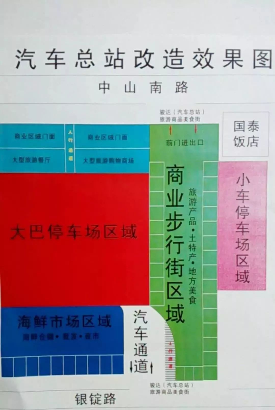 总站搬迁后,原有的候车室、停车场和发车库出现了闲置,这两年该地块临时性地规划为四大功能区域对外招租。分别为:商业步行街、 海鲜市场、经营性停车场、旅游餐厅和购物商场。