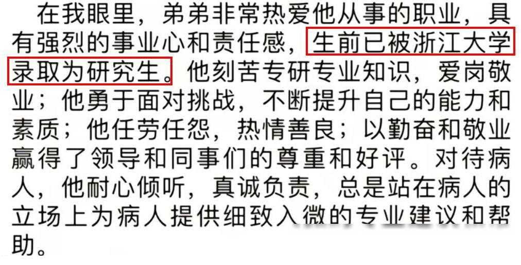 粉色消息传出,潘博文生前已获浙江大学硕士学位,他对职业充满激情与责任感,始终追求专业技能的提高。对待病患,更是尽职尽责,热心温情。