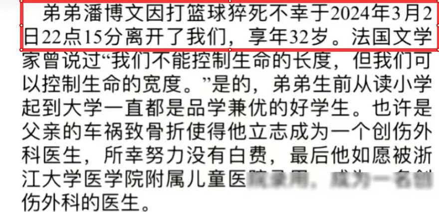 根据家属透露,潘博文于3月2日晚上22点15分在打篮球时突发心脏病去世。他们表示,潘博文从小到大皆为优秀学子,受父亲受伤影响立志成为创伤外科医生。经过不懈努力,他最终成为浙江大学医学院附属儿童医院的一员。