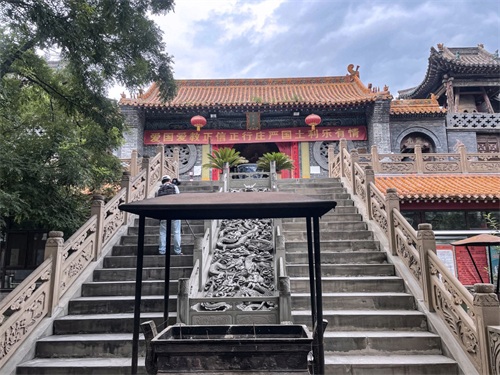 进入寺门,正对着的是天王殿和左右钟、鼓楼。这也是古代寺院的基本建筑规制,属寺院的前殿部分。天王殿供奉的是弥勒菩萨,左右两侧是四大金刚,弥勒菩萨像后边供奉韦驮天尊。弥勒菩萨即弥勒佛,也称未来之佛,袒胸露肚,喜笑颜开,在中国历代备受敬仰和信奉,是一尊笑佛、欢喜佛、幸运佛,据说能给人们带来福气、祥和之气。殿前有丹陛石,数了数似是九龙丹陛。钟、鼓楼为歇山顶建筑。