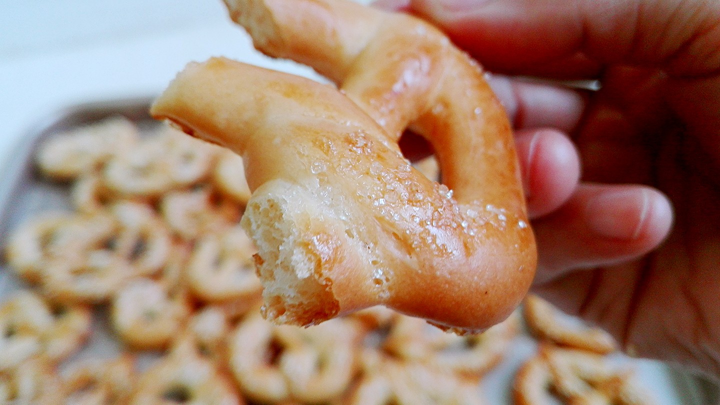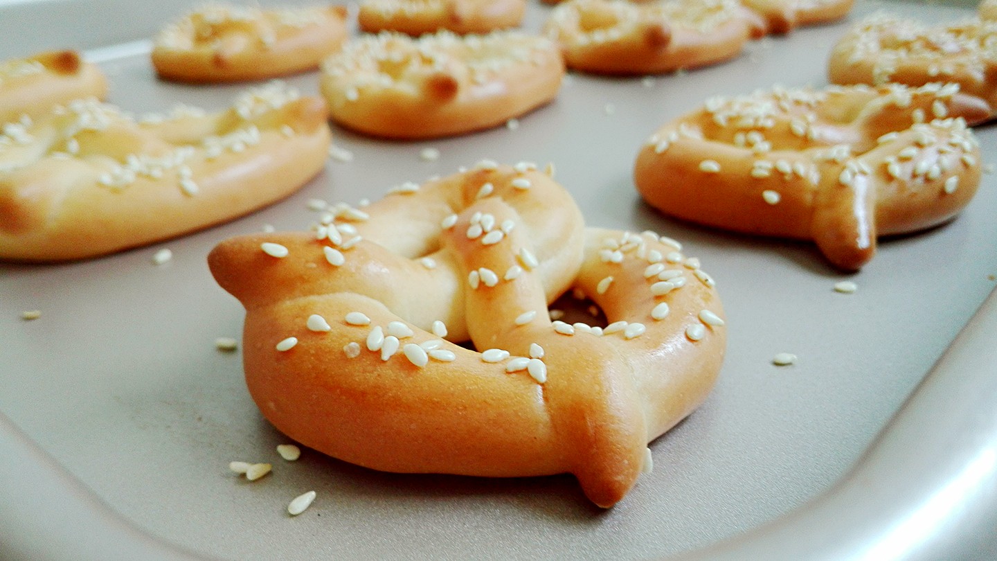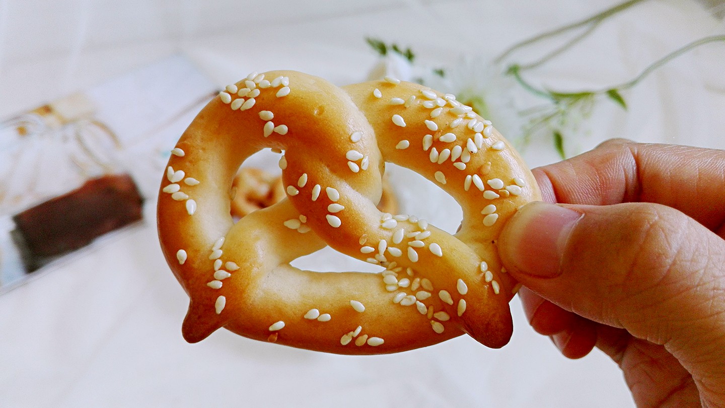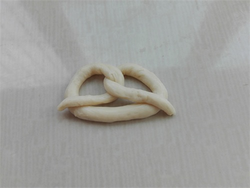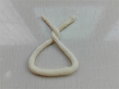 6、按照小面团滚圆的操作顺序,取一个小面团,将其搓成细长条,两自两端向上交叉拧上两下,如图所示。
