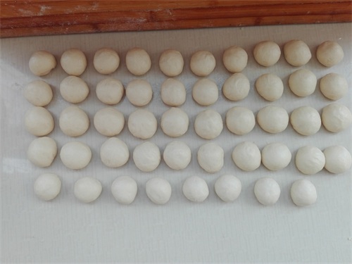 5、将发酵好的面团取出,先在案板上轻微拍打排一下发酵时所产生的气体,然后将其等分成48分小面团,分别将其滚圆,盖好保鲜膜醒发10分钟,如图所示。