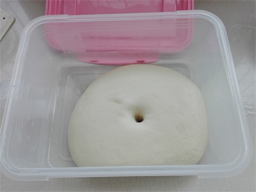 4、将其面团发酵至约为原来面团的两倍大,用手指戳个洞,其洞口是不回缩而且也不会塌陷的状态即可,说明发酵可以了,如图所示。