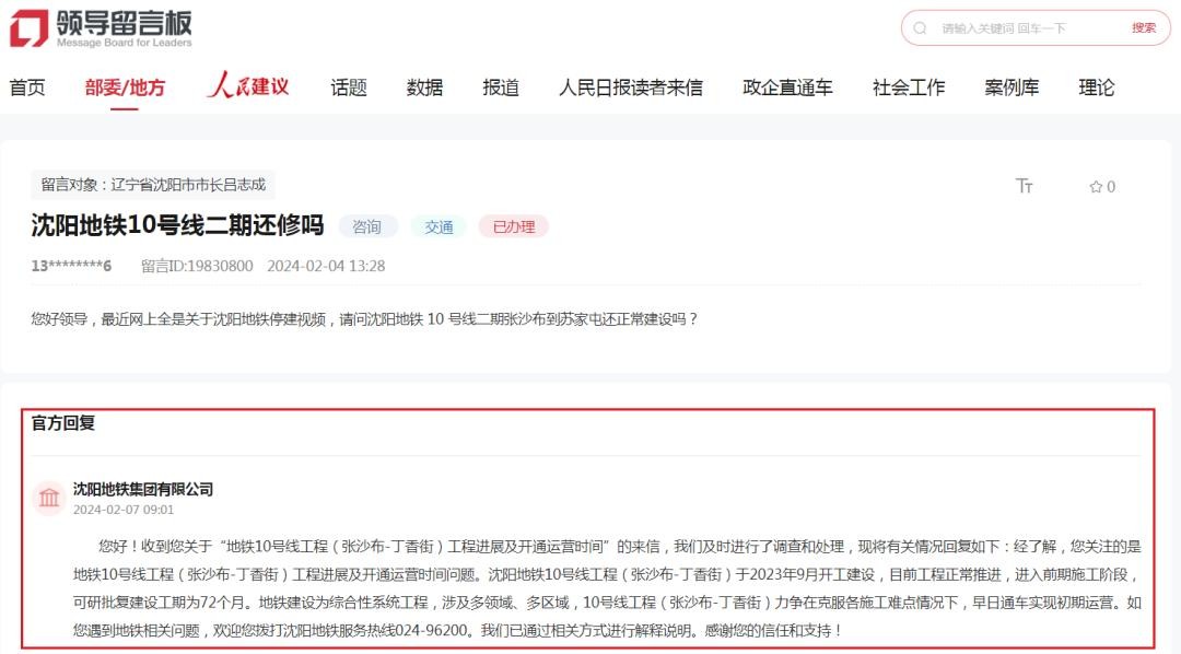 其中,新建的地铁10号线二期,关注度较高。近期,针对市民“沈阳地铁10号线二期还修吗?”的提问,官方回复给人们吃了一颗“定心丸”。