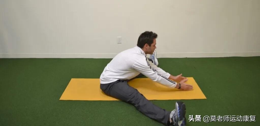 坐在垫子上,双腿分开,躯干慢慢向前移动;此刻大腿远端靠近膝盖的位置会有牵拉感,保持30s以上,重复拉伸4~5组。