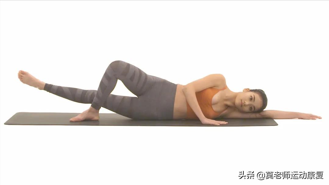 侧卧位,头部置于下方伸直的手臂上,下方腿伸直,上方腿交叉在下方腿前侧保持屈曲状态;保持身体其他地方固定,只抬起下方腿保持2s,此刻大腿内收肌激活,然后再慢慢往地板方向下落;重复上述10~12次,练习2~3组。